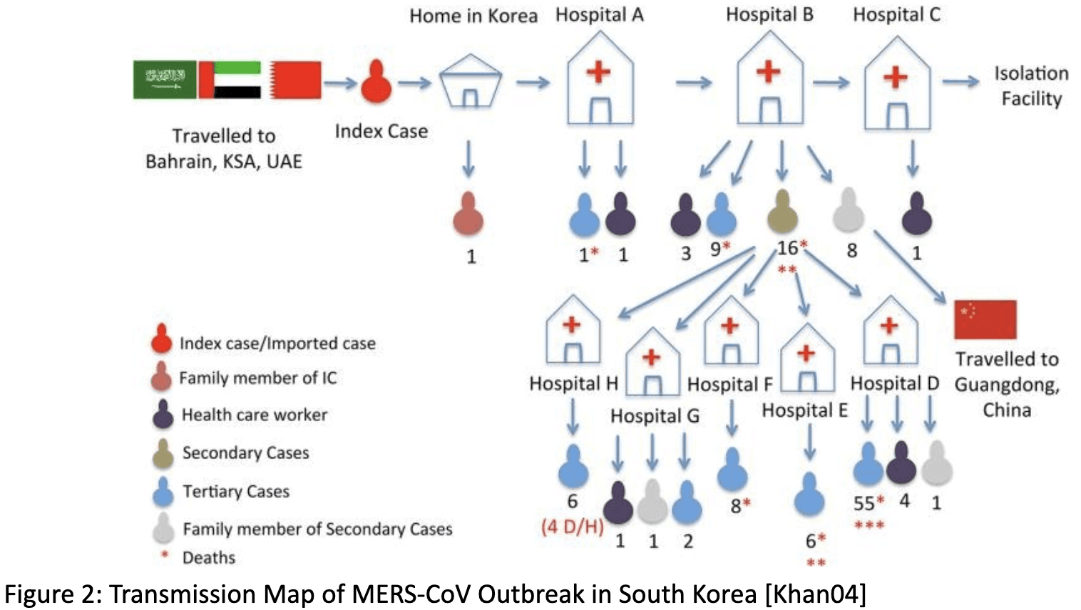 The Republic of Korea’s Center for Disease Control (KCDC) learned key lessons from a 2015 outbreak of the coronavirus MERS-CoV. [Kahn04] In that outbreak 168 cases of the coronavirus MERS-CoV were eventually traced to a single individual who brought it back from a trip to the Middle East. Also possible from that outbreak was the continued spread to additional countries.
