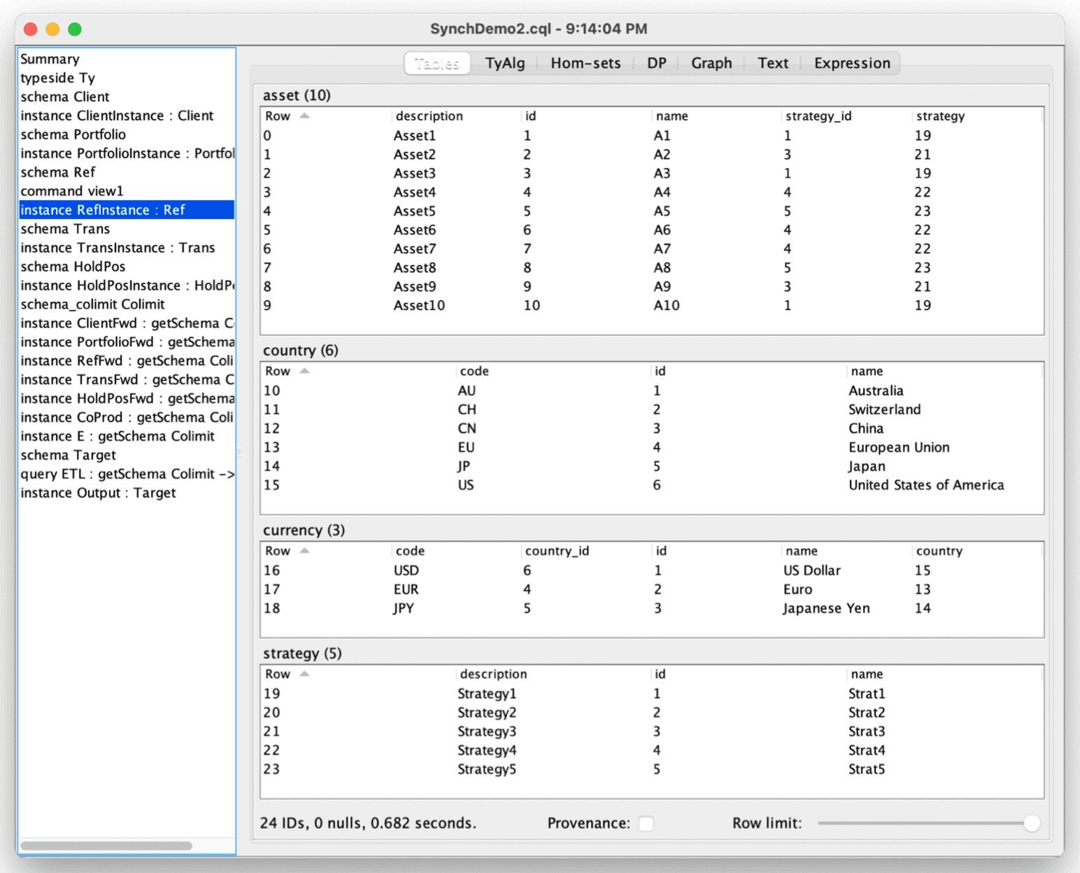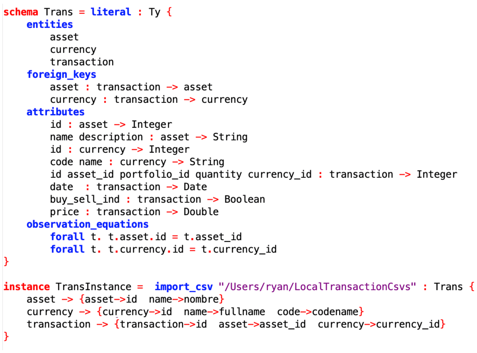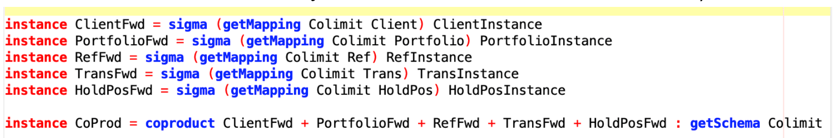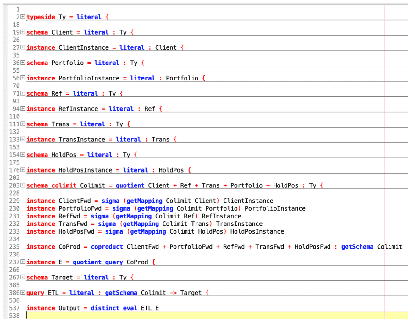 All that remains is to project from our universal data warehouse to the desired target schema. This is done using a CQL “query,” which looks a lot like a set of SQL queries equipped with additional information about how foreign keys are to be connected; CQL requires exactly one such ‘sub-query’ for each target table. CQL comes with a unique value proposition: any data integrity violations will be caught automatically at compile time by the CQL automated theorem prover AI, without running the data. In this particular example it is the portfolio holding table that is tricky to construct: