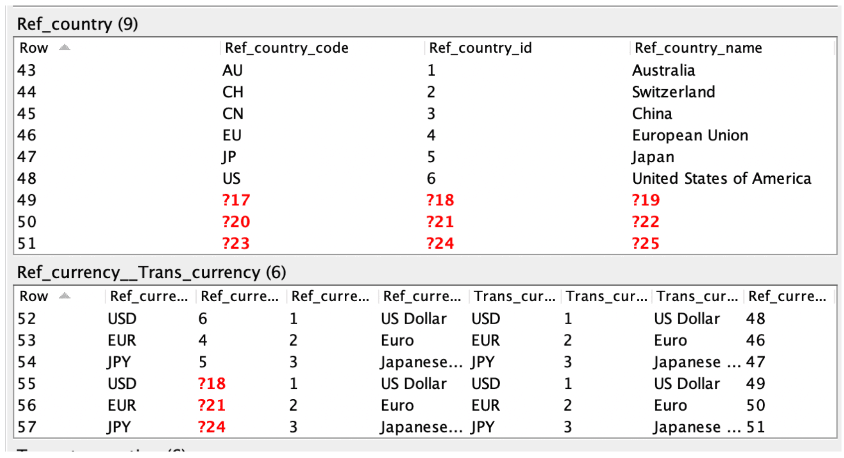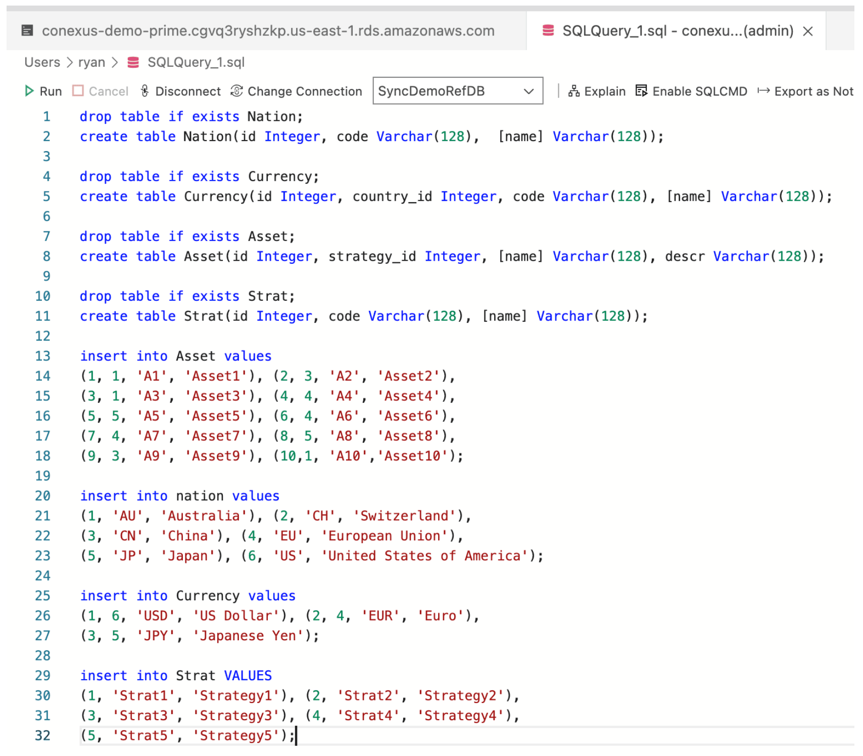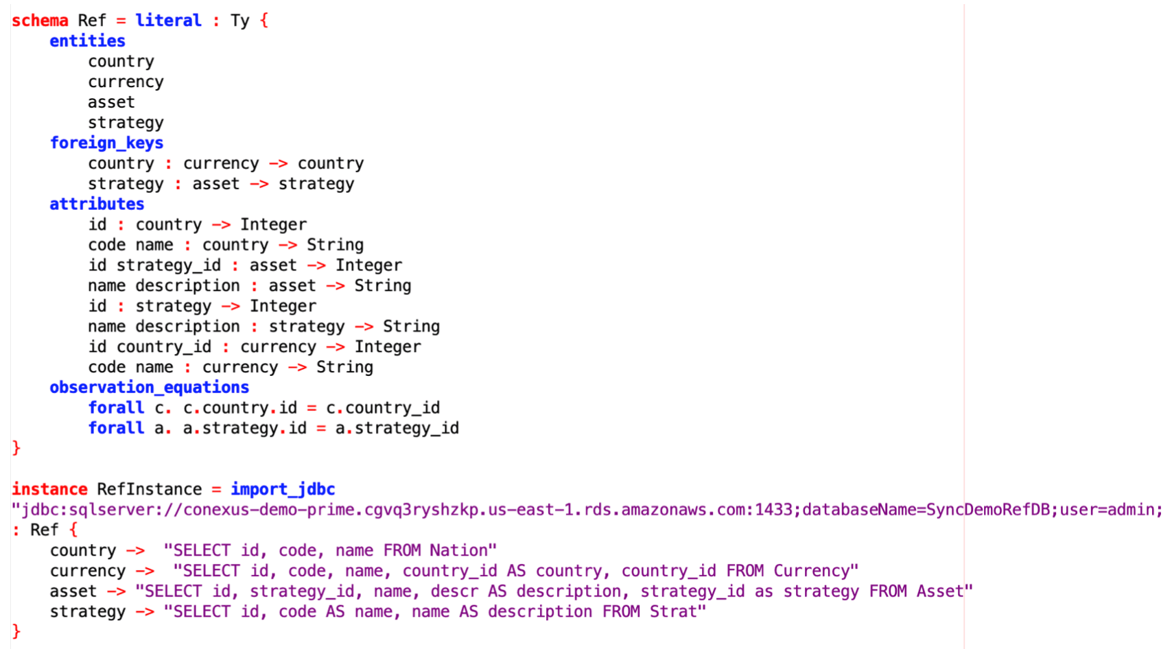 So for example, to land SQL data we write, for each CQL entity, an SQL query saying what data to land. Such SQL queries mediate between column names, change data types, hook up foreign keys, and so on. Below is shown the landing schema for the “Ref” (Reference Data) database. Note that it includes two non-trivial data integrity constraints — two foreign keys. Such constraints can be scanned for in the input data (what we do in this demo), imported from e.g. SQL automatically (a la the DUA product), inferred by AI, etc, but in practice we usually find that these constraints are in the heads of database architects, who can now formalize and store them directly in CQL.