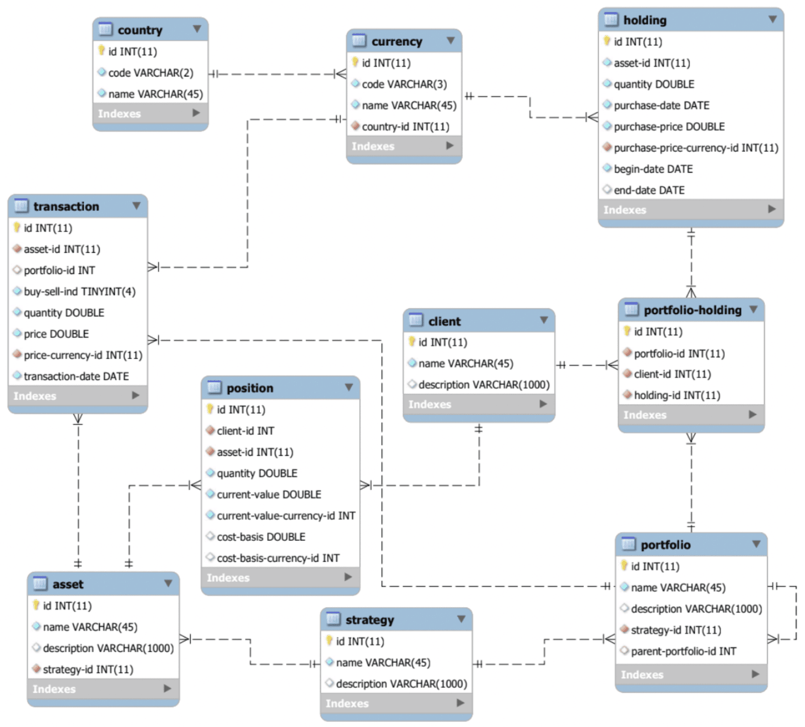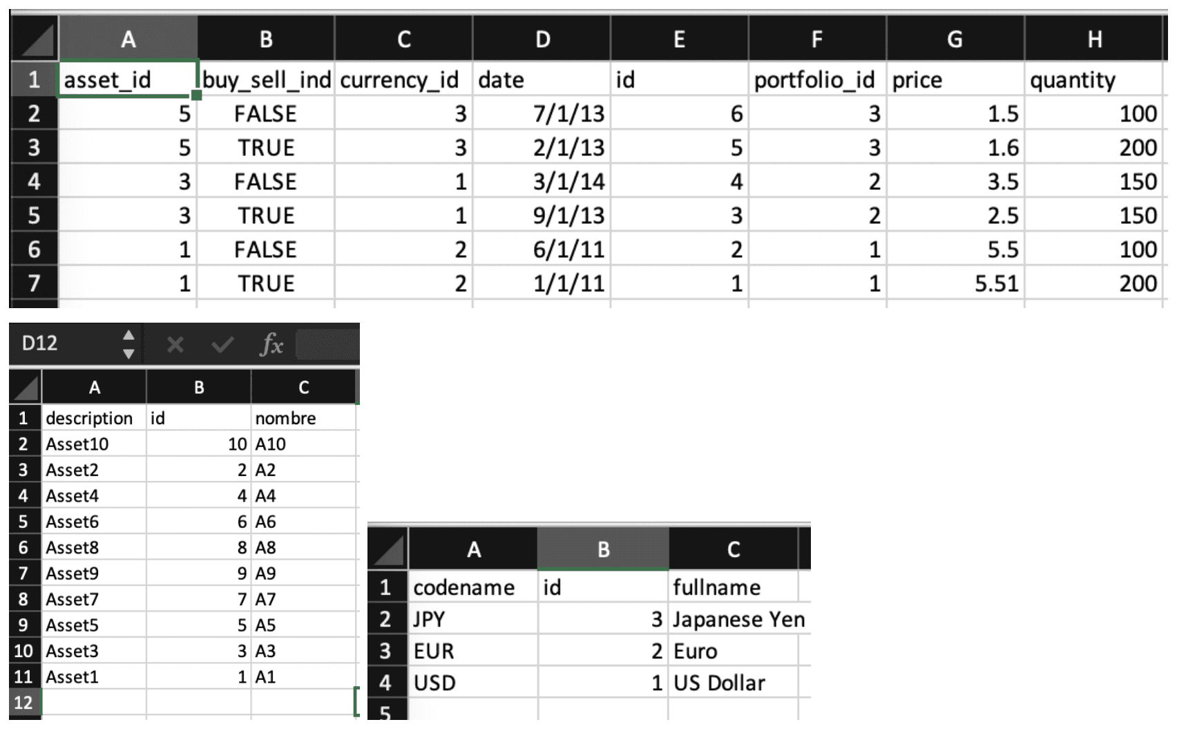 To demonstrate this rapid schema and data integration capability in CQL we will walk through an example (based on the built-in ‘FinanceColim1’ example) of integrating a typical collection of systems for investment management. Because they were built or acquired as separate systems, they contain redundant data whose format and completeness may not be consistent and whose relationships are unclear. Some of the data will come from CSV files on my local computer, some of the data will come from an SQL database on a remote AWS server, and some of the data will come from typing it into CQL directly. The data make up five independent databases, like this: