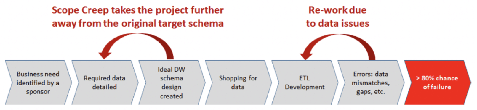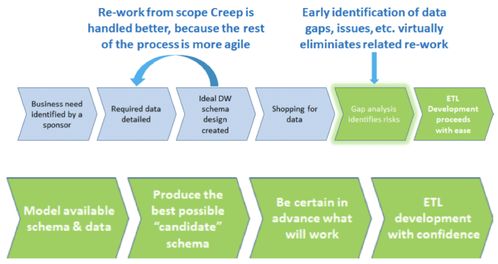 The integrated schema is compared to the desired data warehouse schema to create a gap analysis that quantifies the difference between the available source data and what the project team needs. Many of the data issues are uncovered before any development begins and before any data is moved, allowing up-front risk mitigation.