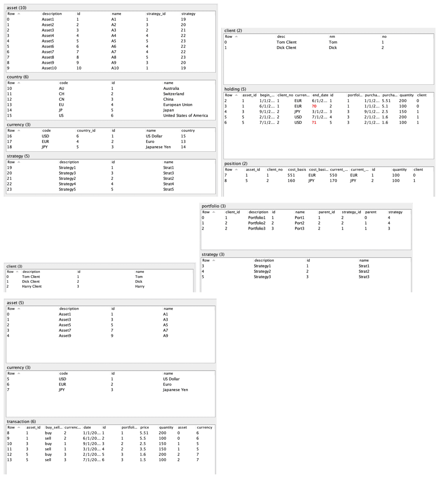 In this example, we can perform a round-trip analysis on the universal warehouse data and query to reveal that the round-trip is surjective (because every client participates in the portfolio holding table at least once) but not injective (because some clients participate more than once, through their various holdings). The high multiplier (3 clients vs 116 client holding positions) indicates that client information is only a small part of what makes up the portfolio holding table.