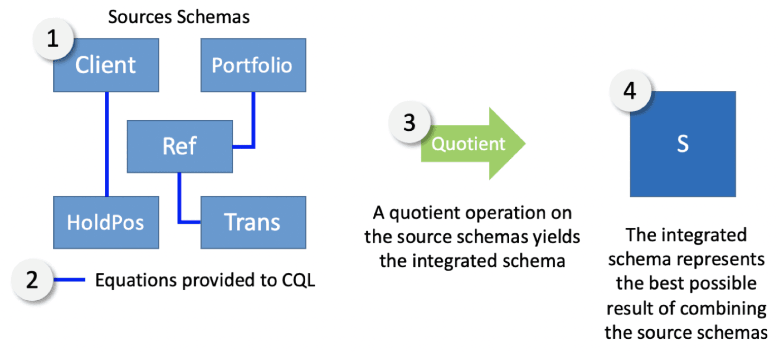 The IT team takes the source schema and uses CQL to define the relationships between the input schemas. From this specification, CQL computes the unique optimally integrated schema that takes into account all of schema matches, constraints, etc.
