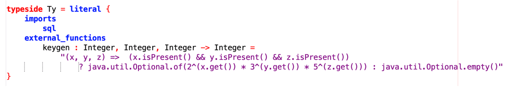 Every CQL development starts by defining the data types and user-defined functions (from any GraalVM language) that will be used in it. In this example, we will use the SQL type system, and add a key-generating function that creates unique integer keys from its three input integers — we will use it in the final step of projecting from the universal data warehouse to the desired warehouse. CQL uses Java’s Optional type for SQL’s nulls, so the keygen function can be seen manipulating the option type.